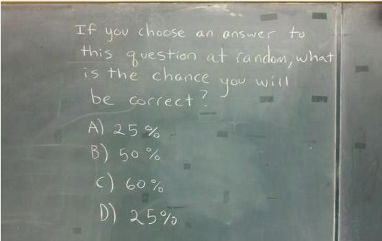You’d think that, since there are four possible answers, that you should answer 25%. However, there are two choices for 25%, so the chance of picking 25% as your answer is 2/4, or 50%. But there’s only one way to answer 50%, so the answer should be 1/4, or 25%. To quote “The King and I,” et cetera, et cetera, et cetera.