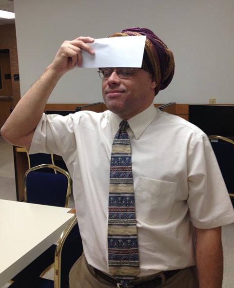 As thanks for reading this far, here’s a photo of me dressed as Carnac as I performed the magic trick. Sadly, most of the senior math majors of 2013 were in diapers when Johnny Carson signed off the Tonight Show in 1992, so they didn’t immediately get the cultural reference.
