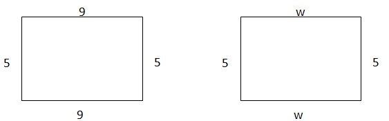 The difficulty of problems using variables is determined by the information given in the problems. For instance, the problem on the right can be a one step equation if an area and perimeter are given so that students only need to solve for w. The difficulty can be increased by giving only a perimeter so that students must solve for w and then for the area.