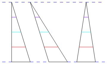 Let’s take a second look at these three triangles. In each triangle, I’ve drawn in three “cross-section” line segments which are parallel to the base. Notice that corresponding cross-sections have equal length. In other words, the red line segments have the same length, the light-blue line segments have the same length, and the purple line segments have the same length.