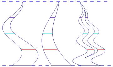 For example, here are three non-triangular regions whose cross-sections match those of the above triangles. The region on the right is especially complex since it has a curvy hole in the middle, so that the cross-sections shown are actually two distinct line segments. Nevertheless, we can say with confidence that, by Cavalieri’s principle, the area of each region matches those of the triangles above.