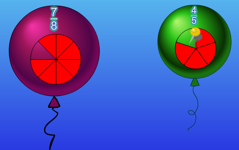 Another computer game that involves comparing fractions is named “Balloon Pop Math.” This is also a good resource to use because it shows balloons with fractions with a visual of a circle divided in equal sections. The idea of this game is to pop the balloon with the smallest fraction to the largest fraction with different denominators. Below is a picture from the game demonstrating the fractions 7/8 and 4/5. The students will be able to see that 4/5 is less than 7/8 by looking at the circle so the student will pop the balloon that contains 4/5. This game is also wonderful to use because it contains three levels. The first level allows the students to compare two fractions. The next one allows the student to compare three fractions, and the last level allows the students to compare four fractions. This will be a good engagement activity to allow the students to do before teaching about how to compare which two fractions is greater than the other.