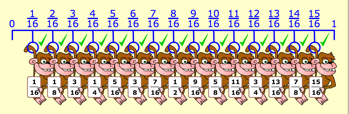 For example, below is a picture of a number line with the denominator being 16. When the student is finished placing the monkeys on the correct location, they will notice that the monkeys were placed differently depending on what fraction they received.
