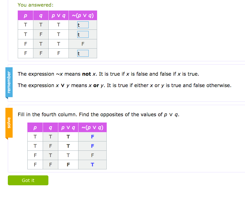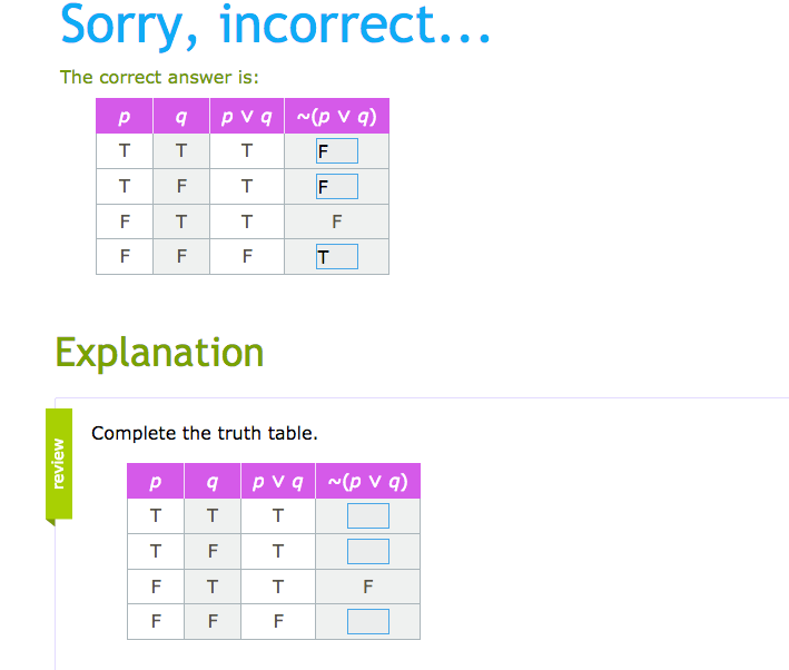 There are many youtube videos that show you how to do truth tables, which is great for when you are learning. But there is a website where students can practice writing truth tables and get immediate feedback if they are right or wrong. The students’ can practice for as long as they want, and it is great repetition for the student to remember how truth tables work and the rules they must follow. With the website when the students get it wrong it will explain why the student was wrong and why the table should be what it is. Below is an example of what the website does when the answer is incorrect.