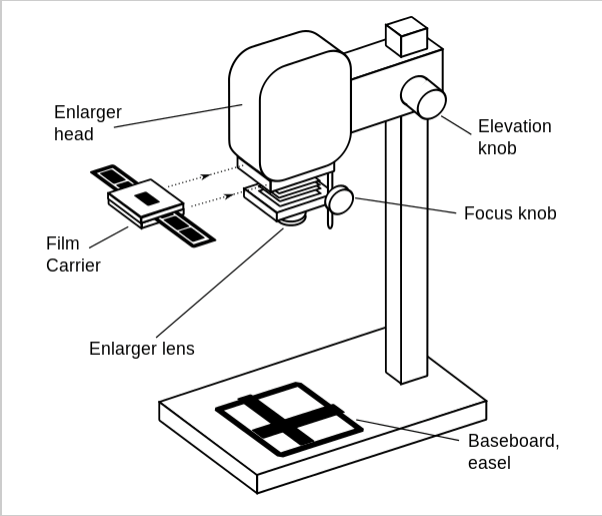 The photo negatives are taken and enlarged through light onto a print by a specific type of transparent projector as the negatives are see-through, light projects onto the negatives which goes through the negative onto the paper on the base. The paper must eventually be developed in a chemical bath to set and hang to dry. The photos must be enlarged, which is a form of dilation by enlarging the size of the photo onto a new surface with the help of scale factors set by the type of enlarger lens on the enlarger (shown on the right). A similar concept is applied with cinema with the projection of a small film strip through a lens with a light onto a large white screen.