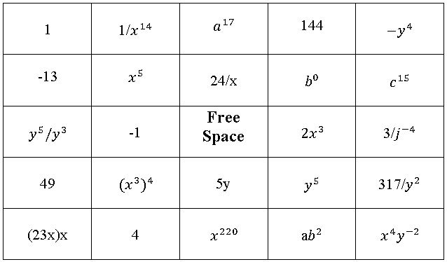 While thinking about different activities that I could do with Laws of Exponents I decided to try making a bingo card. I like this idea because it’s a way for students practice on different problems while playing a game. The way I have it set up to use in a classroom, I have questions that I would ask. One example is . I would put this up on the board and the student has to solve it and see if they have the answer on their card. I would tell the students what the answers were until after we were done with the activity so that they’re not just waiting to hear the answer instead of doing the work. If a student got a “bingo” then I would check their answers and if they got them all right then I would have an incentive like 5 extra points on a homework assignment of their choice or something along those lines.