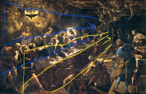 A wonderful example of this concept is The Last Supper by Tintoretto. The table defines the planes of the room. The left-most edge (blue) being the background and the right-most edge (yellow) the foreground. We see that for the blue plane that the ceiling, the heads of the people, and the edge of the table are all set in this plane, so the background is clearly set.