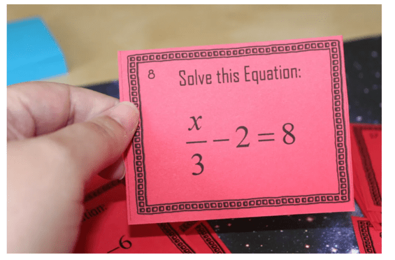 There is an interesting activity that I found online. It is called mini task cards. However, I want to rename this activity as “Find your partners” as an engage activity in this topic. I am going to create some two-step equations on the cards and give those cards randomly to the students at the beginning of the class. Each student has one mini card. The students will have 5 minutes to solve the equations and they will find the partners who have the same answers as them (there is 2-3 person in each group). The person who has the same answer with them will be the partner that they are working together with in the class. I will set up the answer as their group name (for example, if the answer is 1, then it means the group name is “Group One”). Here is an example that how the card will look like.