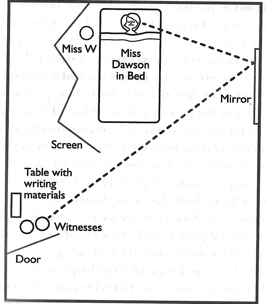 Anyway, with all that as background, in her story Unnatural Death, the following figure depicts an aerial view of a witness’s testimony at a key point in the story. I think I can describe this much of the scene without giving away the plot: the witnesses stood just inside the door of elderly Miss Dawson’s bedroom. A screen blocked direct observation of Miss Dawson as she lay in bed, but the witnesses could see Miss Dawson in the mirror.