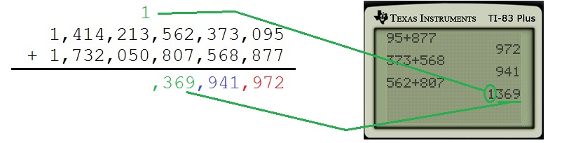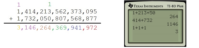This is logically equivalent to using base 1000 to add these two numbers (as opposed to base 10) and is certainly a lot faster than using only one digit at a time. Of course, it’d go even faster if we use up to nine digits a time (which is equivalent to using base one billion).