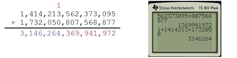 Uh oh… the calculator doesn’t give the complete answer. It does return the first nine significant digits, but it doesn’t return all 16 digits. Indeed, we can’t be sure that the final 7 in the answer is correct because of rounding.