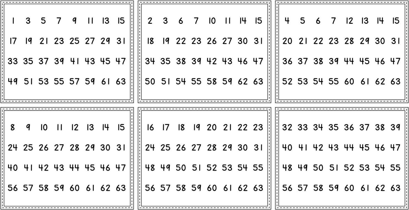 I encourage the reader to develop another set of cards for base 5. It will require 10 cards for numbers from 1 to 24.