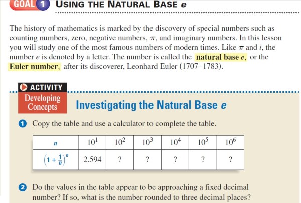 One of the good things about this activity is that it gives a brief snippet of the history of e before students begin to calculate it. Then, students can easily use a calculator and plug in the listed values in the table into the equation . As the numbers get increasingly large, students will notice that they will all appear to be getting closer to 2.718… which is now known as the number e. As a teacher it is important to note that e is like pi, it is an irrational number that goes on forever and doesn’t have any sort of repeating pattern, yet it is extremely important in mathematics.