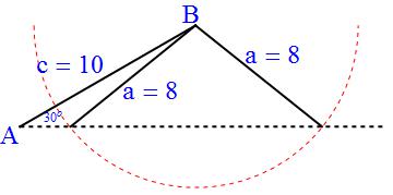 Solve \triangle ABC if a = 8, c = 10, and \alpha = 30^\circ.