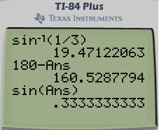 This is incorrect logic that, as we’ll see tomorrow, nevertheless leads to the correct conclusion. This is incorrect logic because there are two angles between 0^\circ and 180^\circ with a sine of 1/3. There is one solution in the first quadrant (the unique answer specified by arcsine), and there is another answer in the second quadrant — which is between 90^\circ and 180^\circ and hence not a permissible value of arcsine. Let me demonstrate this in three different ways.
