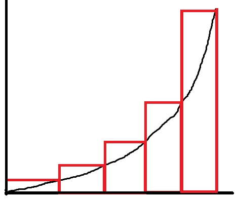Eventually either a student volunteers (or else I tell the class) that we ought to use a bunch of thin rectangles. For starters, I’ll use five rectangles and a very rough sketch on the board.