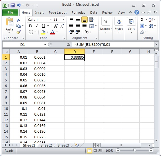 By now, the class sees what the next steps are: take more and more rectangles. At this point, I’ll resort to classroom technology to make the process a little quicker. I personally prefer Microsoft Excel, though other software packages can be used for this purpose. For rectangles, the class quickly sees that the sum of the rectangles is