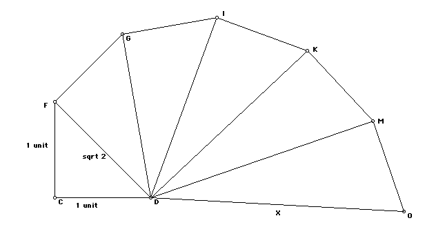 The final side should be sqrt(7), and the hypotenuses should go sqrt(2), sqrt(3), sqrt(4)β¦all the way up to x. Hopefully students will be fascinated by the relationship!