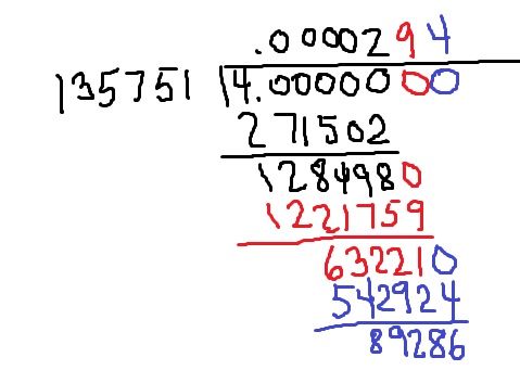With these gifted students, I encourage thinking as much as possible without a calculator… and they wanted me to provide the answer to this one in like fashion. For my class, this actually did serve a purpose by illustrating a really complicated long division problem so they could reminded about the number of leading zeroes in such a problem.