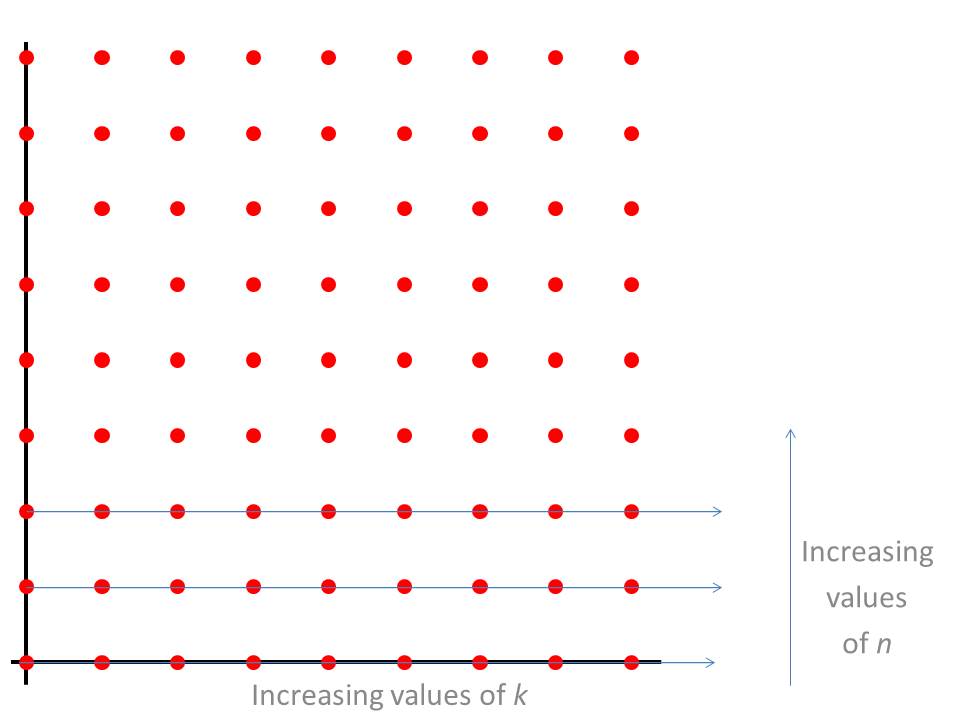 . Each red dot symbolizes a term in the above double sum. For a fixed value of