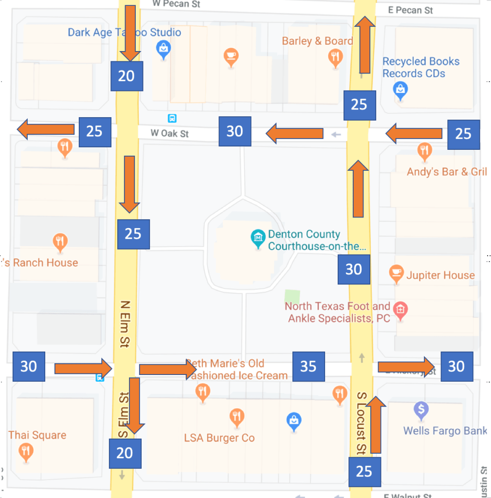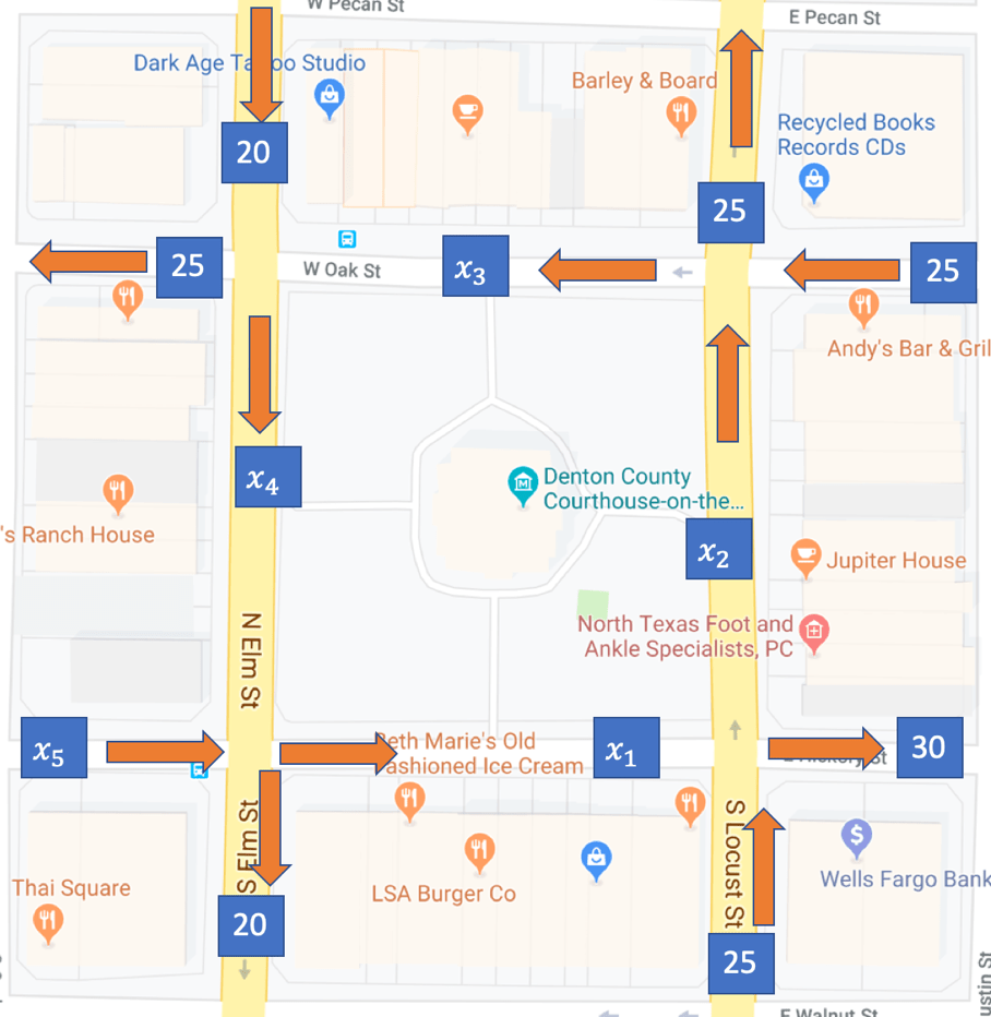 The Square in Downtown Denton is a popular place to visit and hang out. A new business owner needs to decide which road he should put an advertisement so that the most people will see it as they drive by. He does not have enough resources to traffic every block and street, but he knows that he can use algebra to solve for the ones he missed. In the above map, he put a blue box that contains the number of people that walked on each street during one hour. Use a system of linear equations to determine how much traffic is on every street/block on this map.